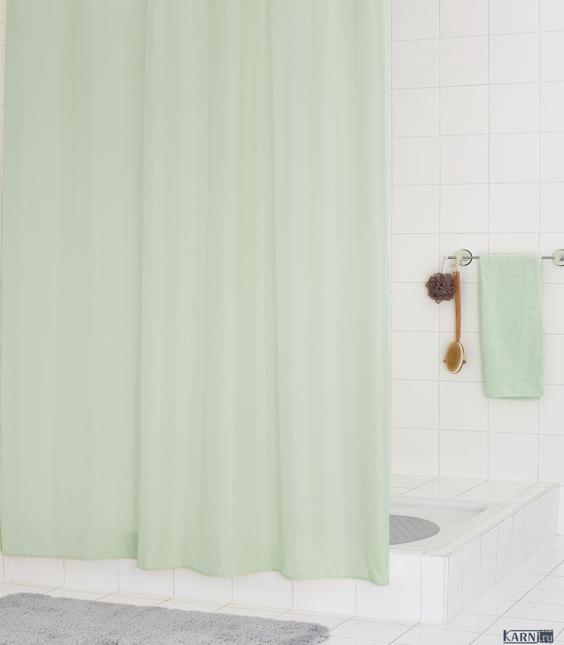 Занавеска из 100% полиэстера для ванны с 12 люверсами под кольца. Штора обработана специальной пропиткой, отталкивающей воду. Внизу по всей длине вшит шнур-утяжелитель.