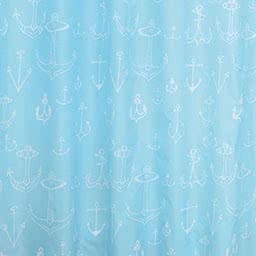 Занавеска для ванны с 12 вшитыми люверсами, надевается непосредственно на карниз (так же может использоваться с кольцами для удобства эксплуатации). Цвет: голубой. Штора обработана специальной пропиткой, отталкивающей воду.