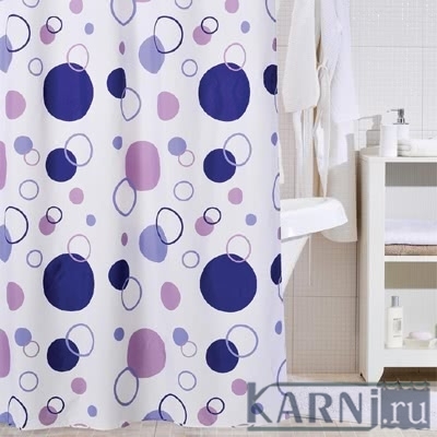 Занавеска из 100% полиэстера для ванны с 12 металлическими люверсами под кольца. Штора обработана специальной пропиткой, отталкивающей воду.