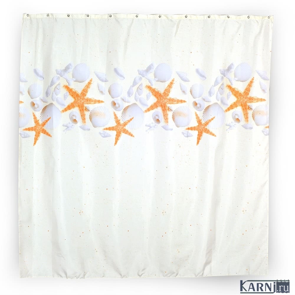 Занавеска из 100% полиэстера для ванны с 12 люверсами под кольца. Штора обработана специальной пропиткой, отталкивающей воду. Внизу по всей длине вшит шнур-утяжелитель.